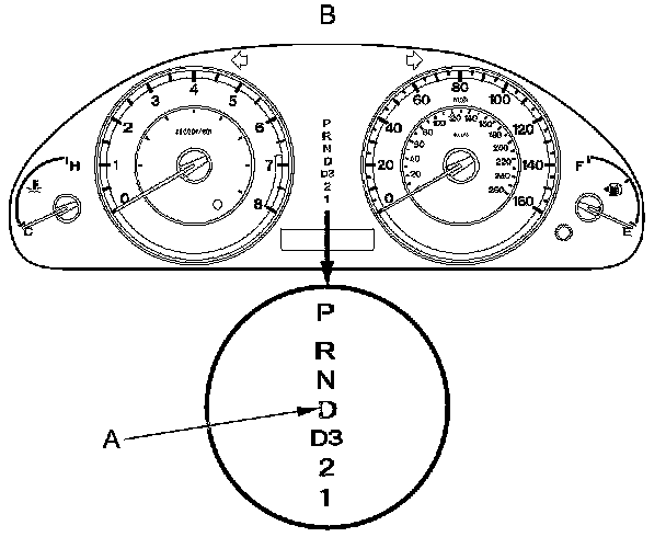 When the powertrain control module (PCM) senses an abnormality in the input or output system, the D indicator (A) in the gauge control module (B) will usually blink.