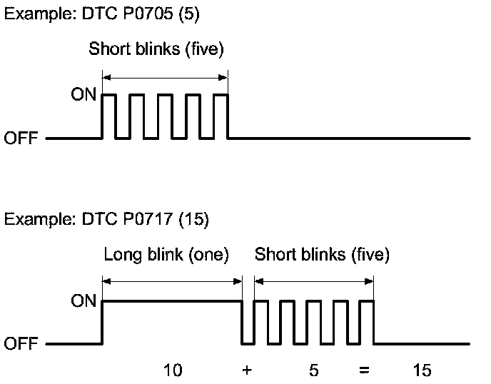 3. Select SCS mode, then observe the D indicator in the gauge control module. Codes 1 through 9 are indicated by individual short blinks. Code 10 and above are indicated by a series of long and short blinks. One long blink equals 10 short blinks. Add the long and short blinks together to determine the code.