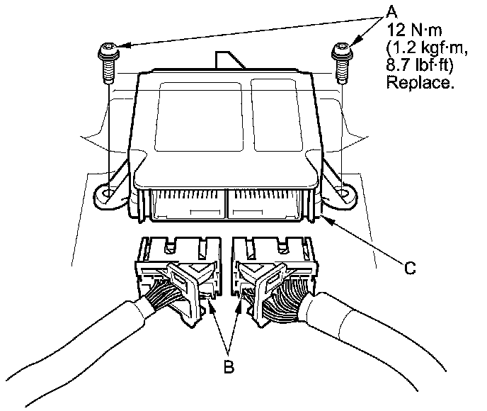 2. Install the new TORX bolts (A) using a TORX T30 bit, then connect the connectors (B) to the SRS unit (C); push them into position until they click.