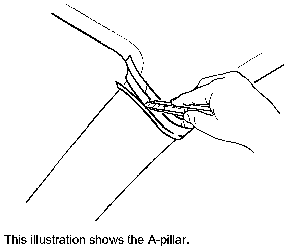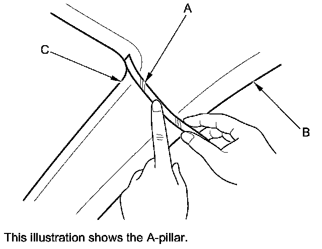 2. Apply masking tape (A) to the headliner (B) to mark the upper edge of the pillar trim (C).