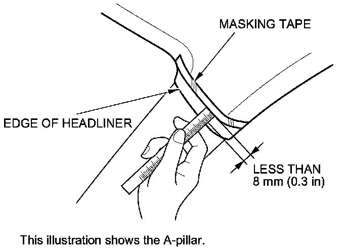 To prevent the side curtain airbag from deploying and damaging the pillar trim (A-pillar trim, B-pillar trim, C-pillar trim), the overlap between the headliner and pillar trim must be less then 8 mm (0.3 in). To check the overlap, do this: