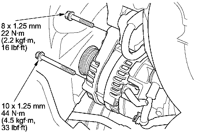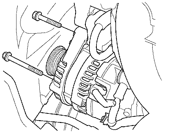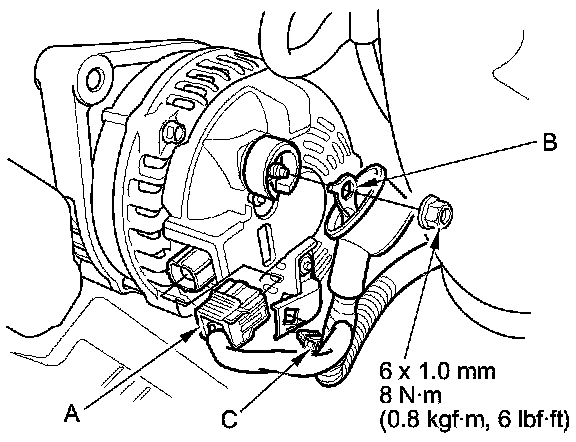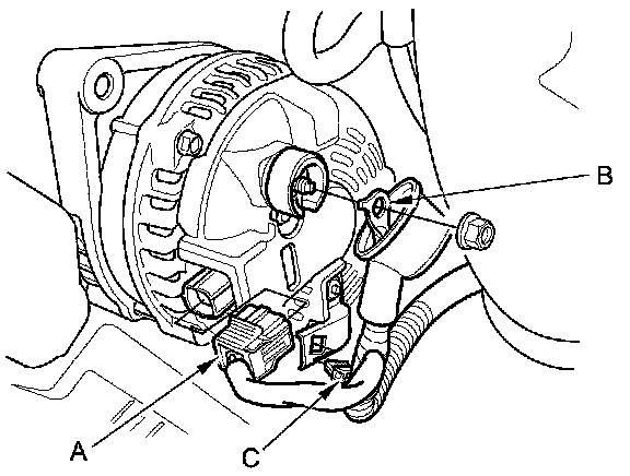 1. Install the alternator, then connect the alternator connector (A) and the positive alternator cable (B), and install the harness clamp (C). Make sure the crimped side of the ring terminal faces away from the alternator when you connect it.