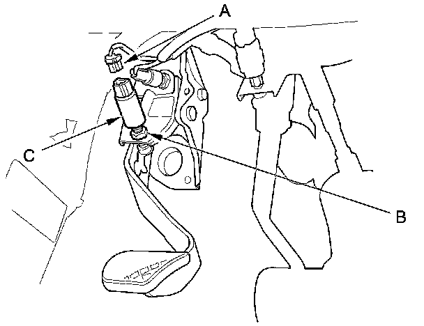 2. Loosen the locknut (B), then remove the clutch pedal position switch (C).