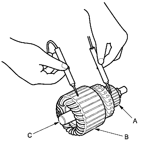 9. Use an ohmmeter to check for continuity between the commutator (A) and the armature coil core (B), and between the commutator and the armature shaft (C). If there is continuity, replace the armature.