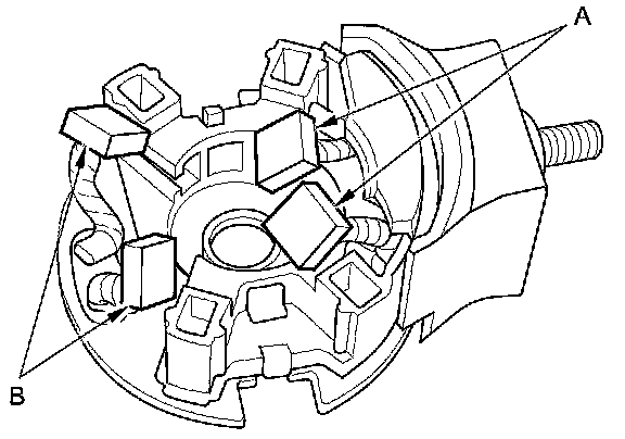 11. Check for continuity between the (+) brushes (A) and the (-) brushes (B). If there is continuity, replace the brush holder assembly.