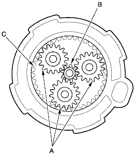 12. Check the planetary gears (A), the armature shaft gear (B), and the internal ring gear (C). Replace them if they are worn or damaged.