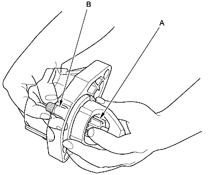 16. Install the brush into the brush holder, and set the armature (A) in the brush holder (B).