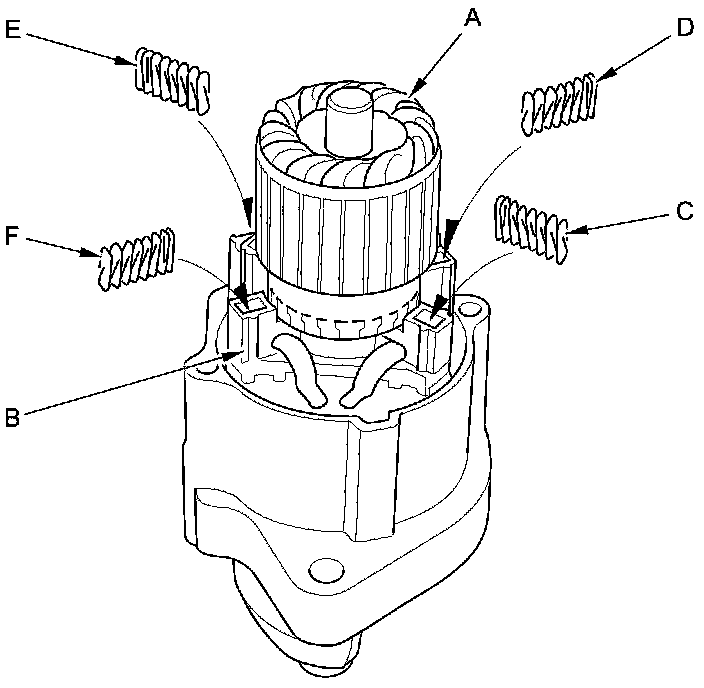 17. While squeezing a spring (C), insert it in the hole on the brush holder, and push it until it bottoms. Repeat this for the other three springs (D, E, and F).