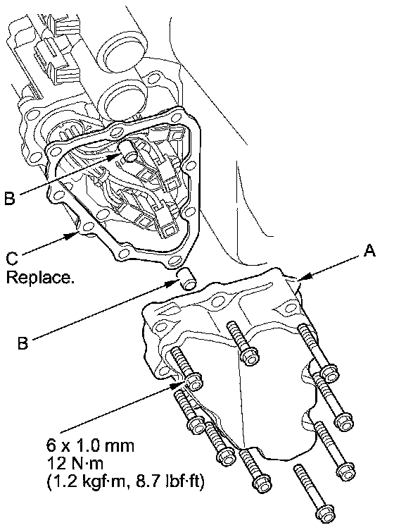 8. Remove the shift solenoid valve cover (A), the dowel pins (B), and the gasket (C).