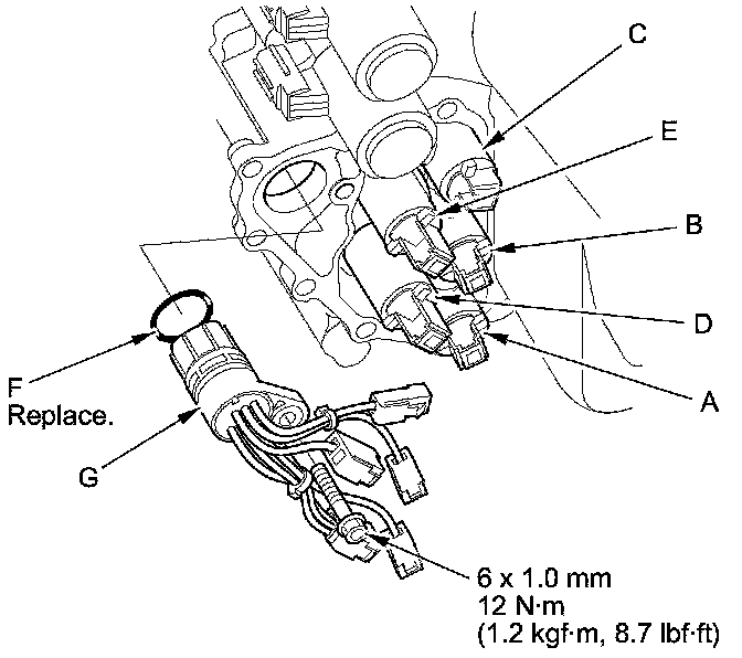 10. Disconnect the connectors from the shift solenoid valves. Then replace the ATF temperature sensor and the O-ring (F) with new ones.