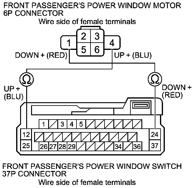 6. Check for continuity between the front passenger's power window switch 37P connector terminals and front passenger's power window motor 6P connector terminals as shown. There should be continuity.
