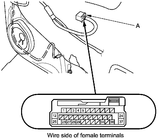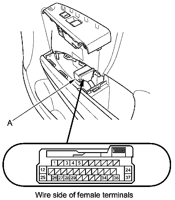 2. Test the motor in each direction by connecting battery power and ground to the front passenger's power window switch 37P connector (A) according to the table.