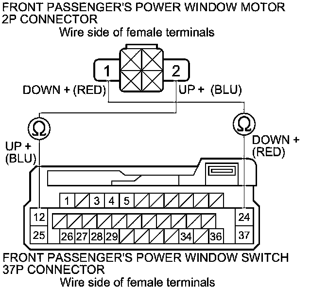 6. Check for continuity between the front passenger's power window switch 37P connector terminals and front passenger's power window motor 2P connector terminals as shown. There should be continuity.