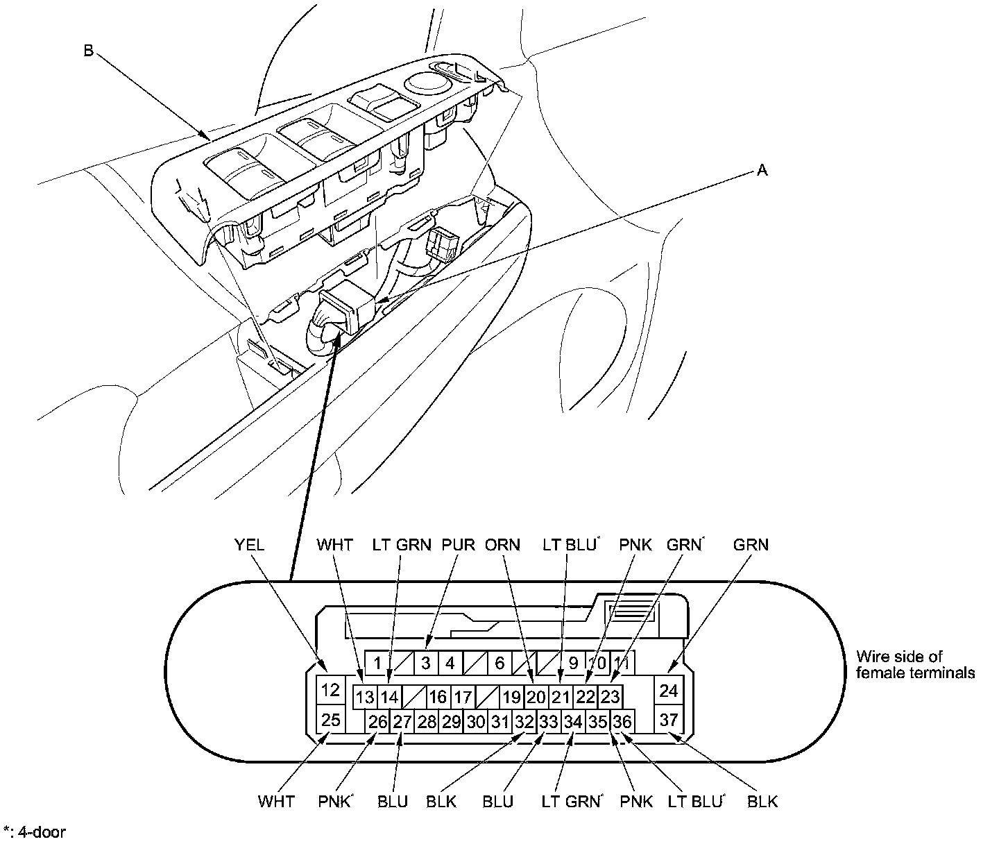 2. Disconnect the 37P connector (A) from the door power window master switch (B).
