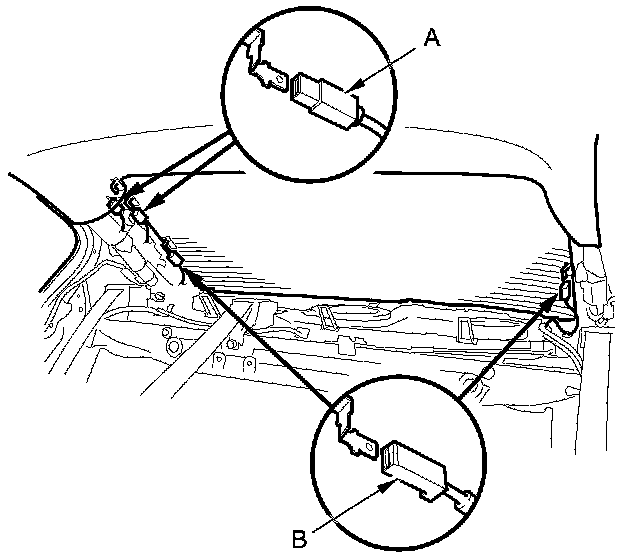 2. Disconnect the window antenna connectors (A) and the rear window defogger connectors (B). 4-door is shown; 2-door is similar.