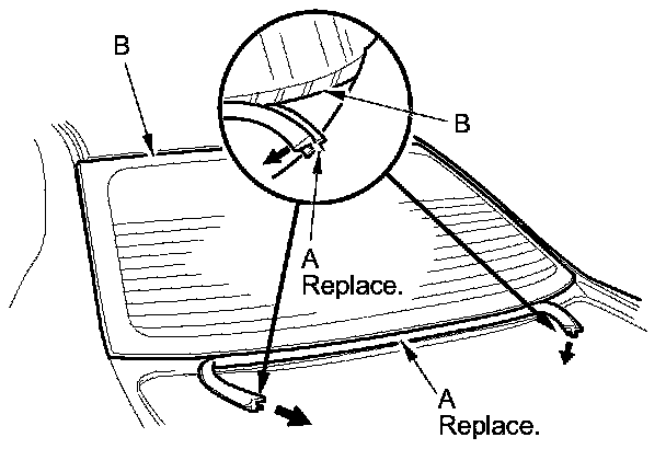 6. Remove the lower rubber dam (A) from the lower edge of the rear window (B). If necessary, cut the rubber dam with a utility knife. 4-door is shown; 2-door is similar.