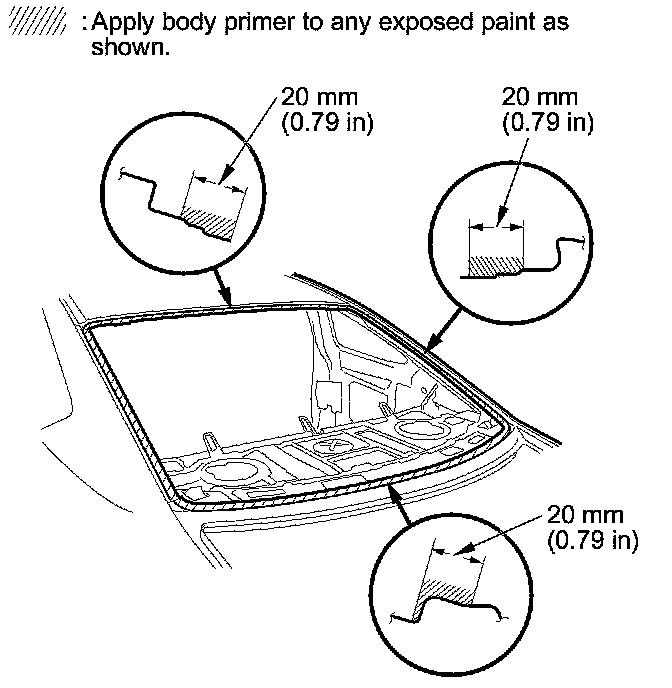 18. Carefully apply a light coat of body primer to any exposed paint or metal around the flange where the new adhesive will be applied. Let the body primer dry for at least 10 minutes: