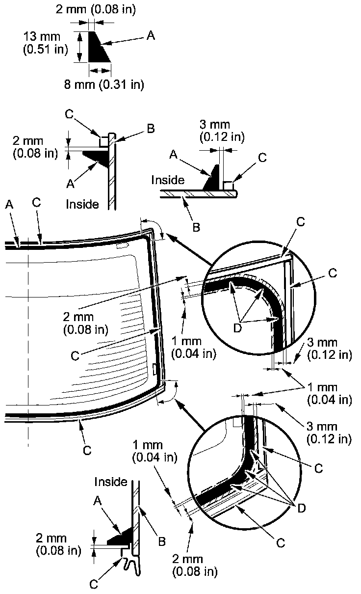 20. Put the cartridge on a caulking gun, and run a continuous bead of the adhesive (A) to the rear window (B) along the edge of the rubber dams (C) as shown: