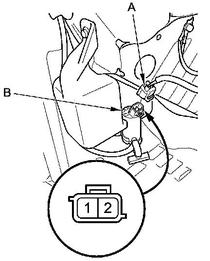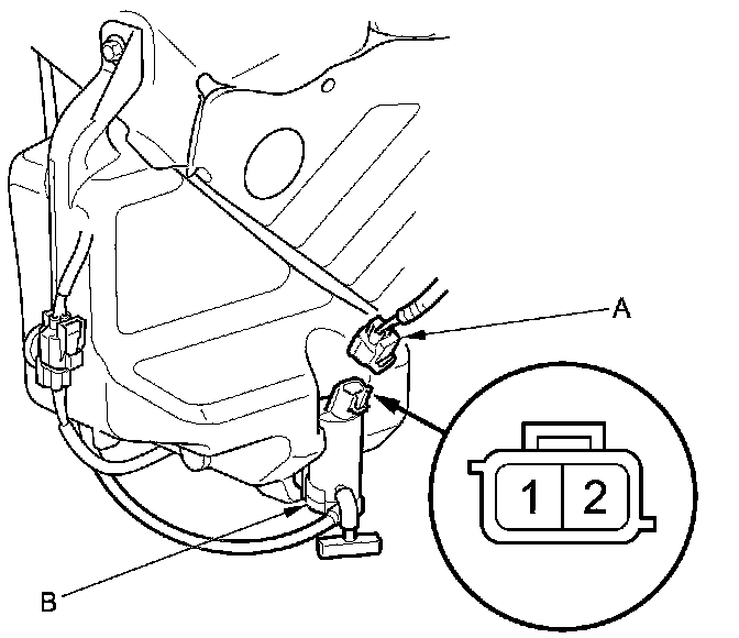 2. Disconnect the 2P connector (A) from the windshield washer motor (B).