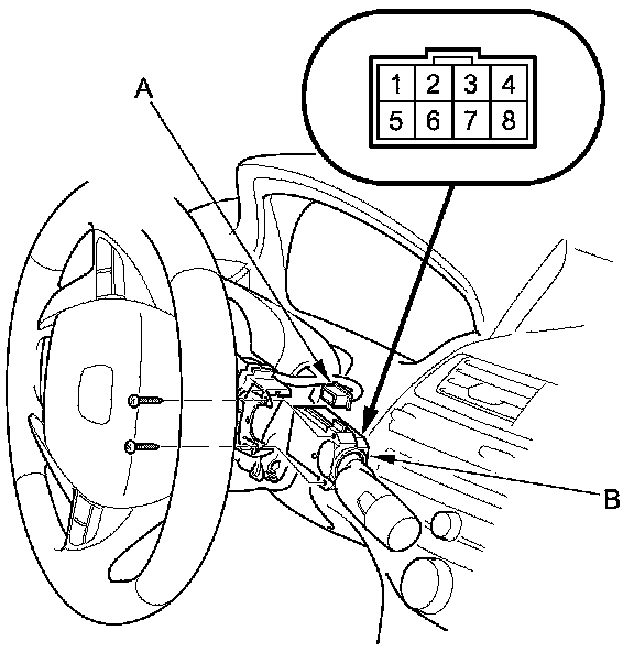 2. Disconnect the dashboard wire harness 8P connector (A) from the wiper/washer switch (B).