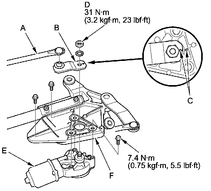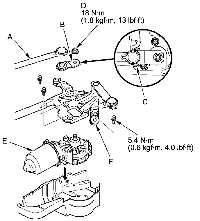 6. Remove the three bolts, and separate the windshield wiper motor from the linkage (F).