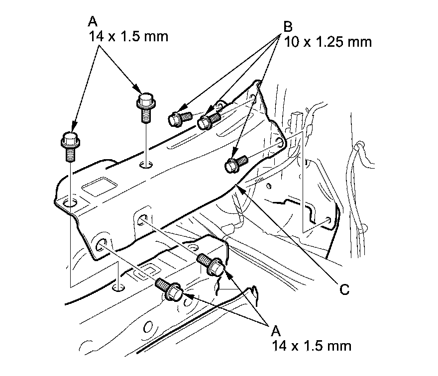 3. Remove the bolts (A, B), then remove the middle crossmember gusset (C).