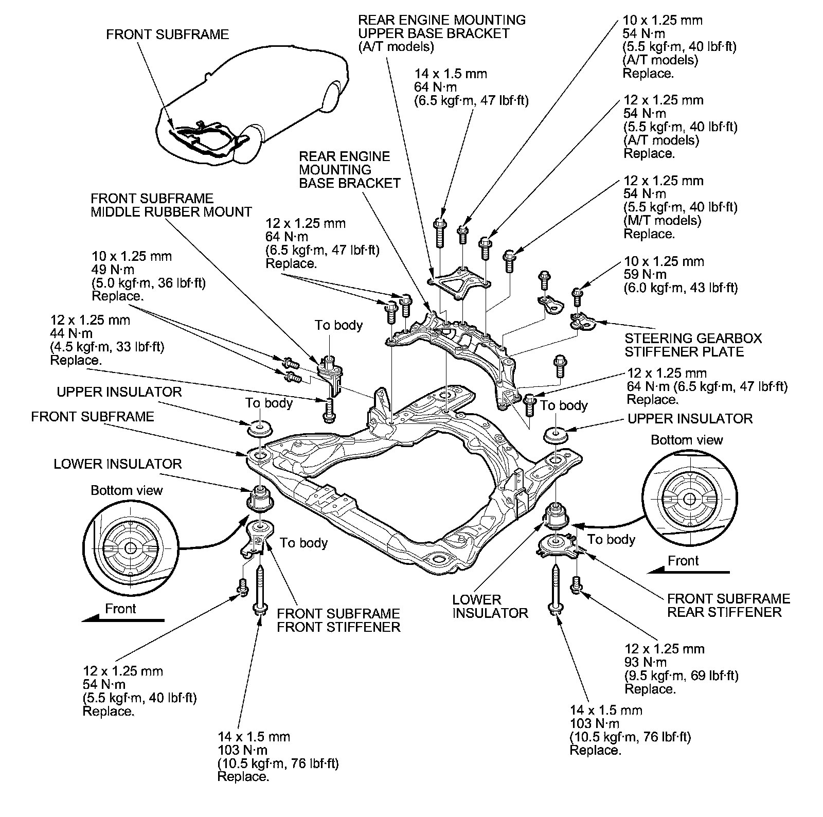 After removing the subframe mounting bolts, the front subframe middle rubber mount mounting bolts, the front subframe rear stiffener mounting bolts, the rear engine mounting base bracket mounting bolts, and the rear engine mounting upper base bracket mounting bolts (A/T models), be sure to replace them with new ones.