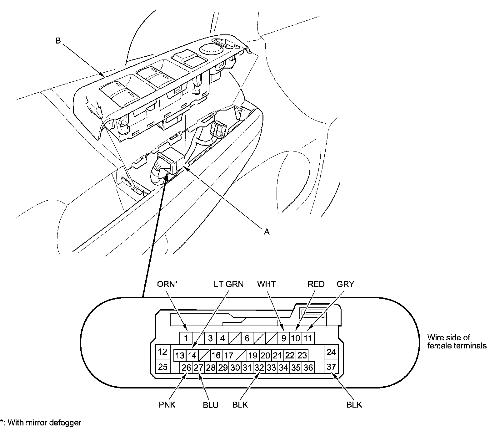 2. Disconnect the 37P connector (A) from the power window master switch (B).