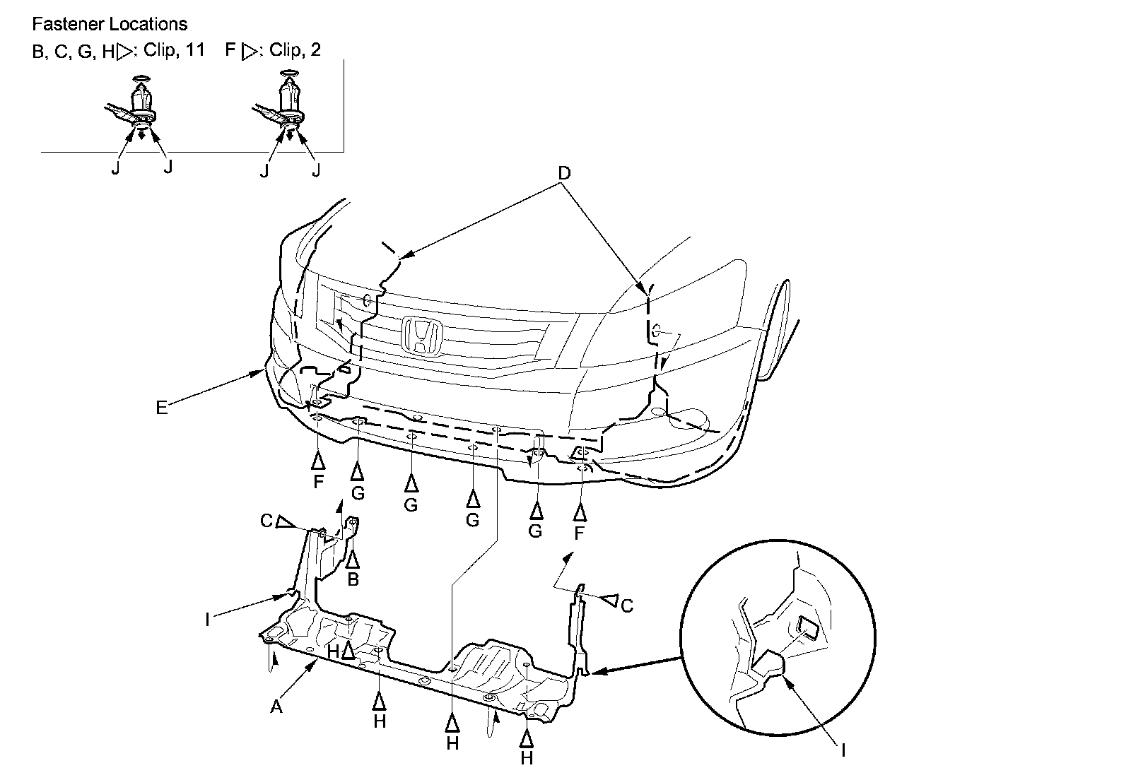 5. From under the body, detach the clips (H) that secure the front splash shield to the front subframe.