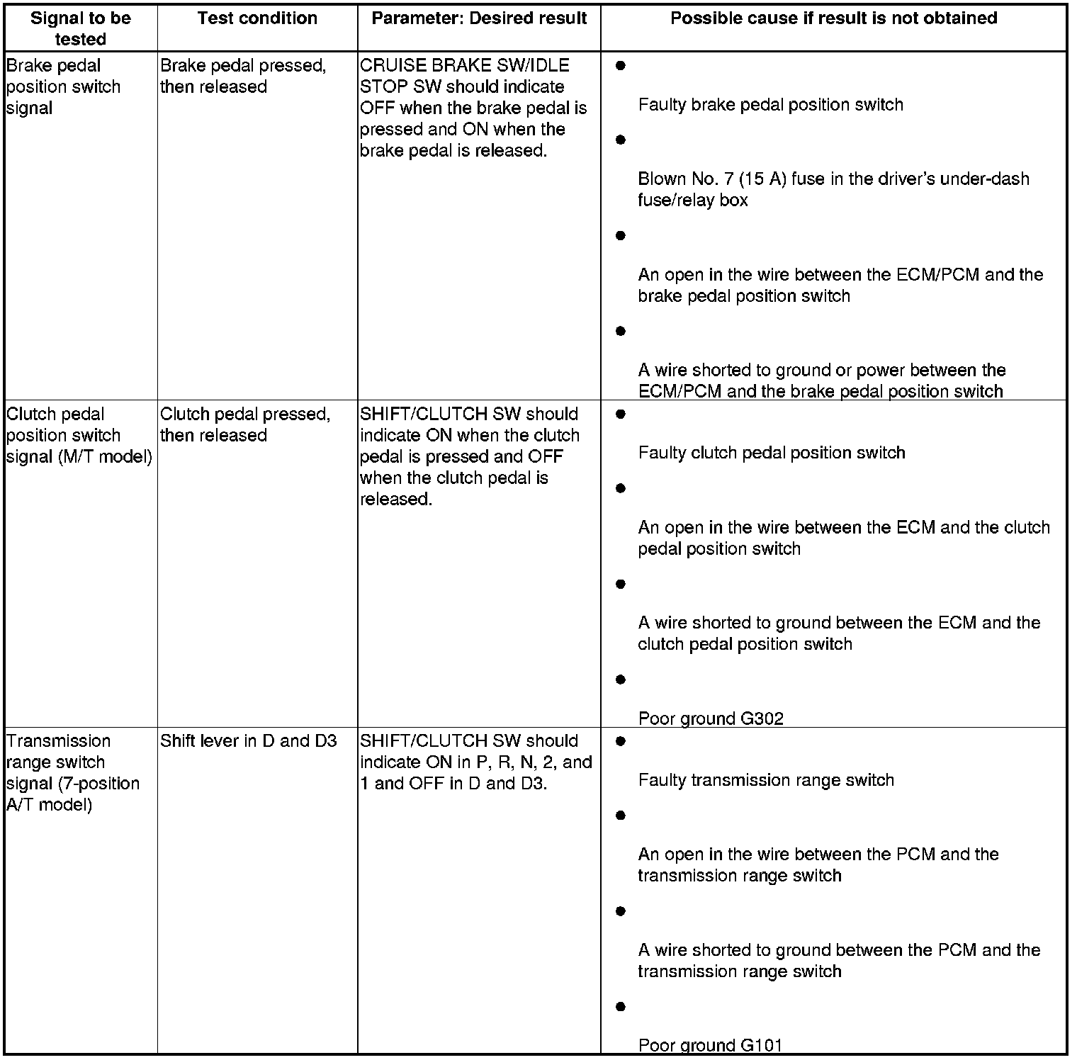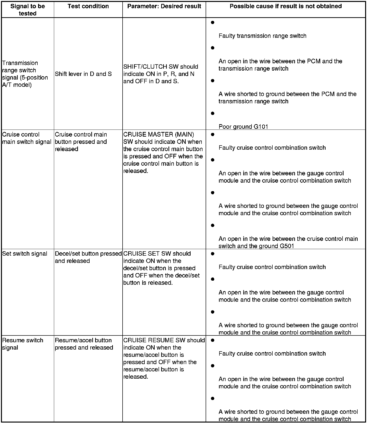 NOTE: Intermittent failures are often caused by loose circuit connections. While monitoring cruise control inputs, flex the circuit wires, and note if any of the test results change.