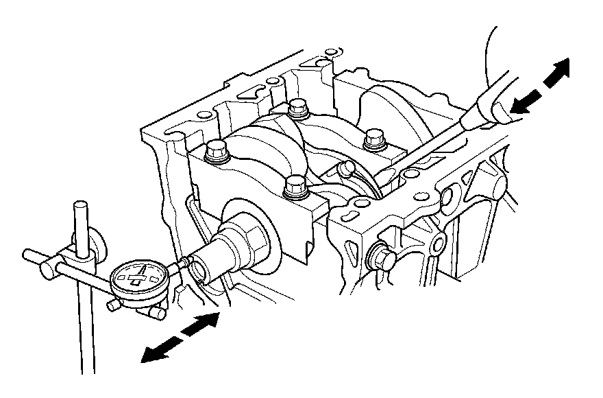 5. Push the crankshaft firmly away from the dial indicator by prying, and zero the dial against the end of the crankshaft. Then pull the crankshaft firmly back toward the indicator by prying; the dial reading should not exceed the service limit.
