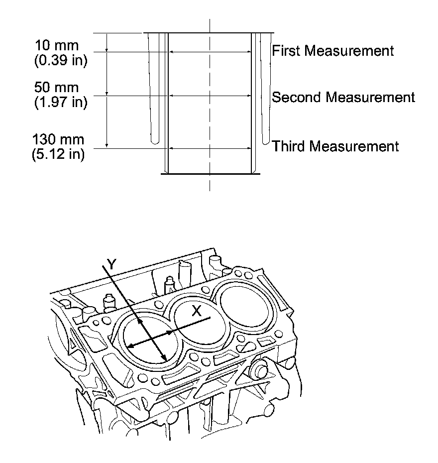 4. Measure the wear and taper in direction X and Y at three levels in each cylinder as shown. If measurements in any cylinder are beyond the oversize bore service limit, replace the engine block. If the engine block has to be rebored, refer to step 7 after reboring.