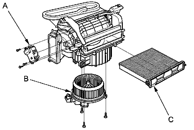 - The recirculation control motor (A), the blower motor (B), and the dust and pollen filter (C) can be replaced without removing the blower unit.