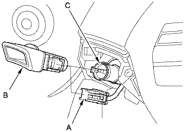 2. Disconnect the connector (A), and remove the in-car temperature sensor (B) from the air hose (C).