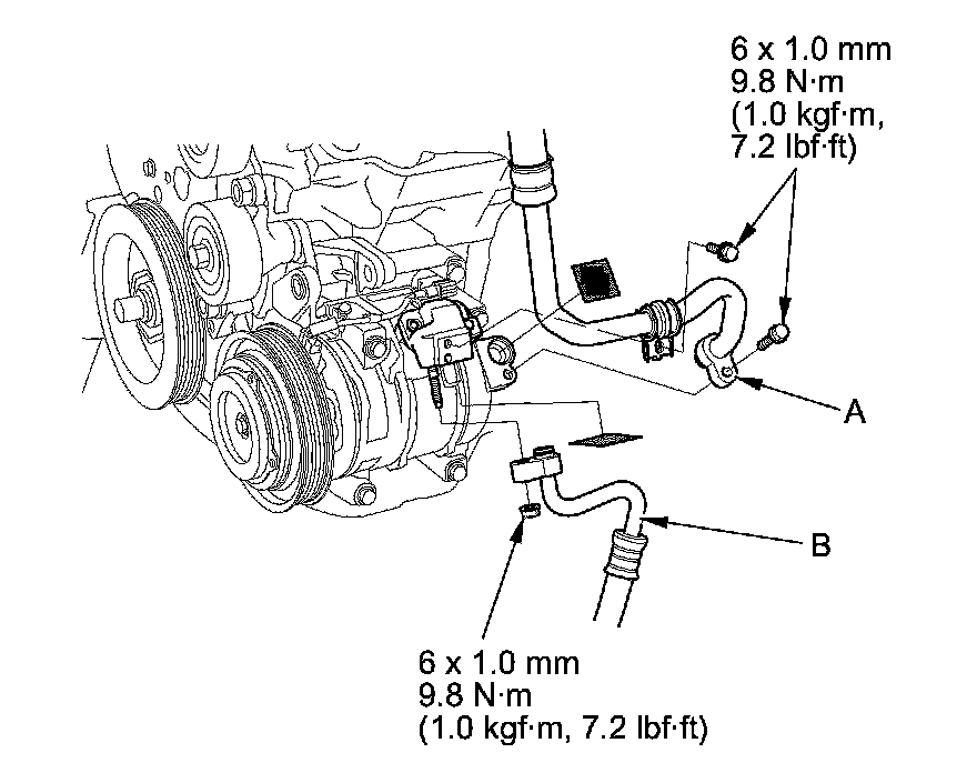 5. Remove the bolts and the nut, then disconnect the suction hose (A) and the discharge hose (B) from the A/C compressor. Plug or cap the lines immediately after disconnecting them to avoid moisture and dust contamination.