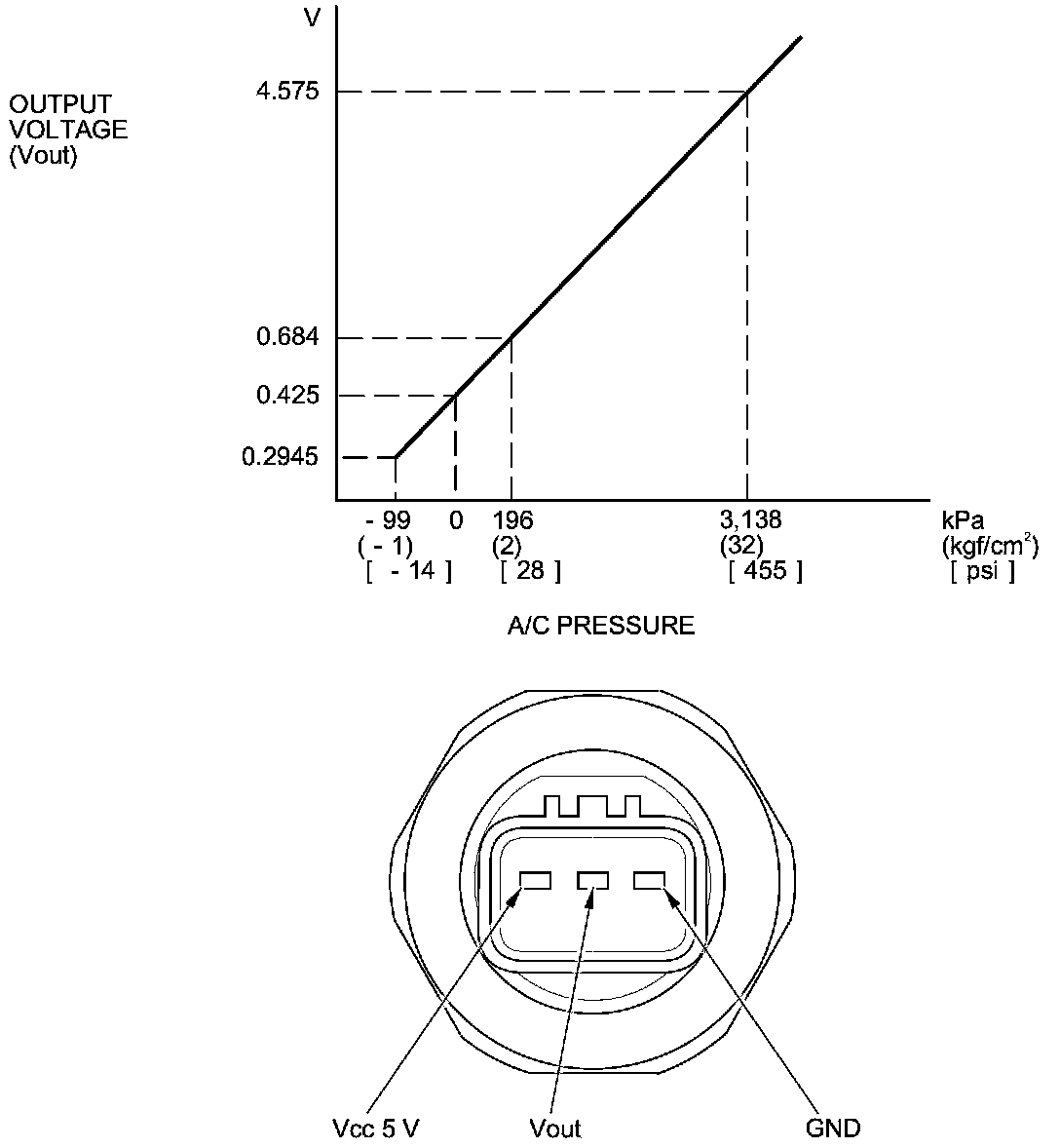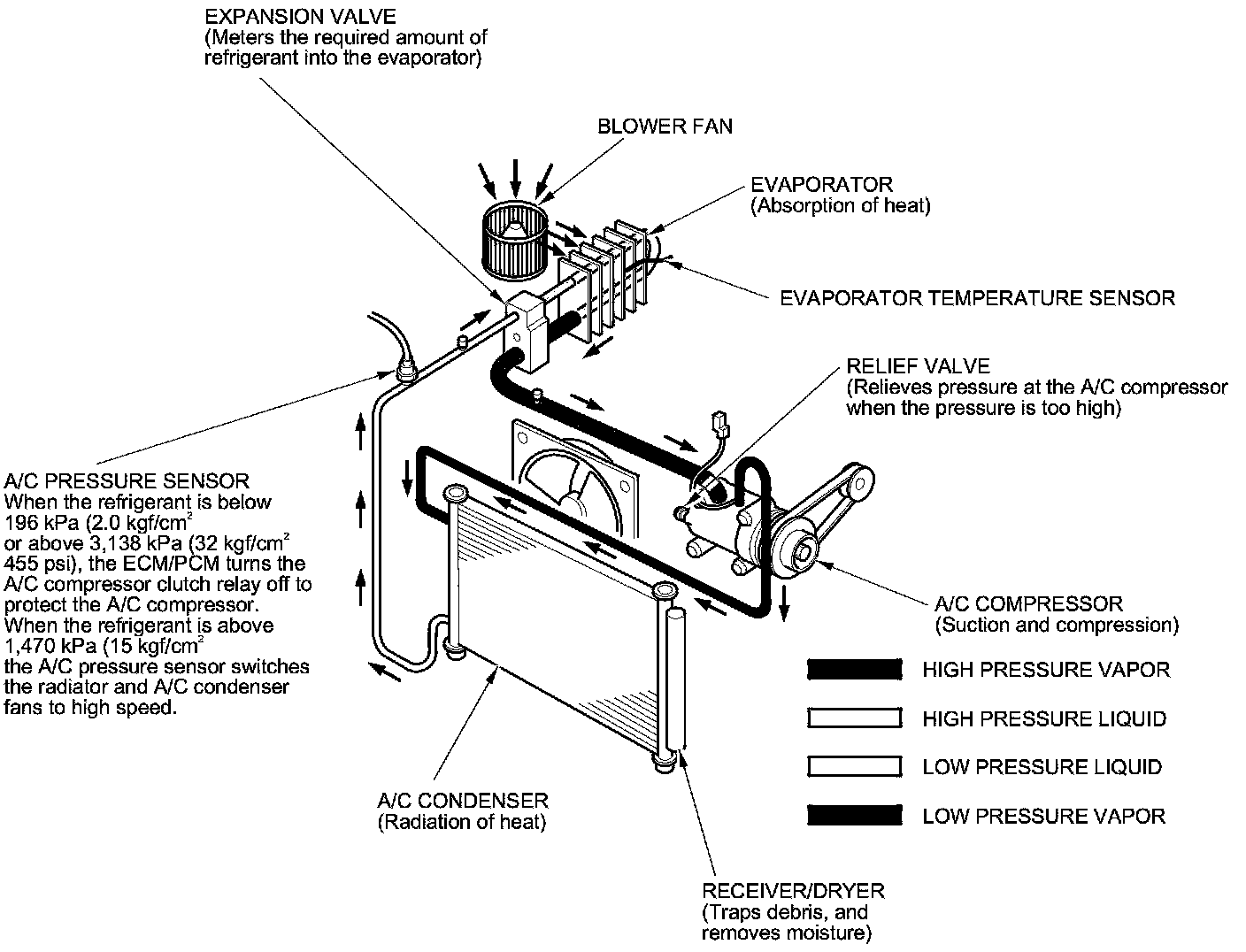 NOTE: When the refrigerant is below 196 kPa (2.0 kgf/cm2, 28 psi) or above 3,138 kPa (32 kgf/cm2, 455 psi), the ECM/PCM turns the A/C compressor clutch relay off to protect the A/C compressor. When the refrigerant pressure is above 1,470 kPa (15.0 kgf/cm2, 213 psi), the ECM/PCM switches the radiator and A/C condenser fans to high speed.