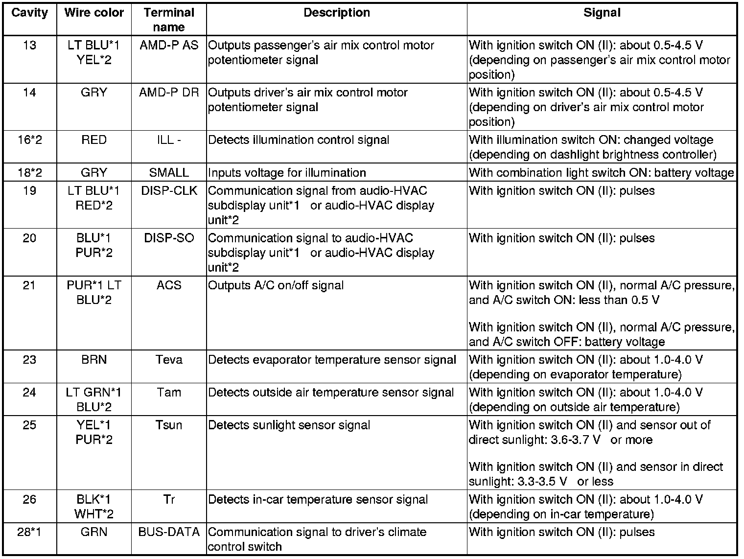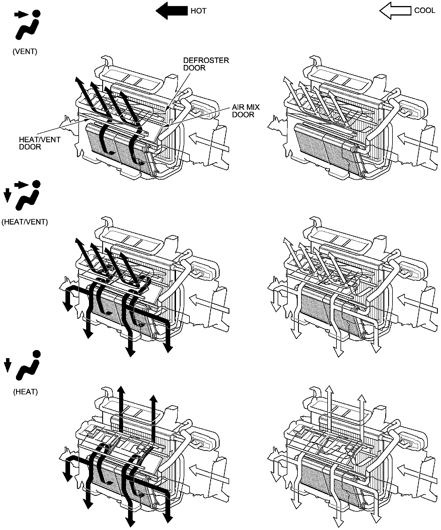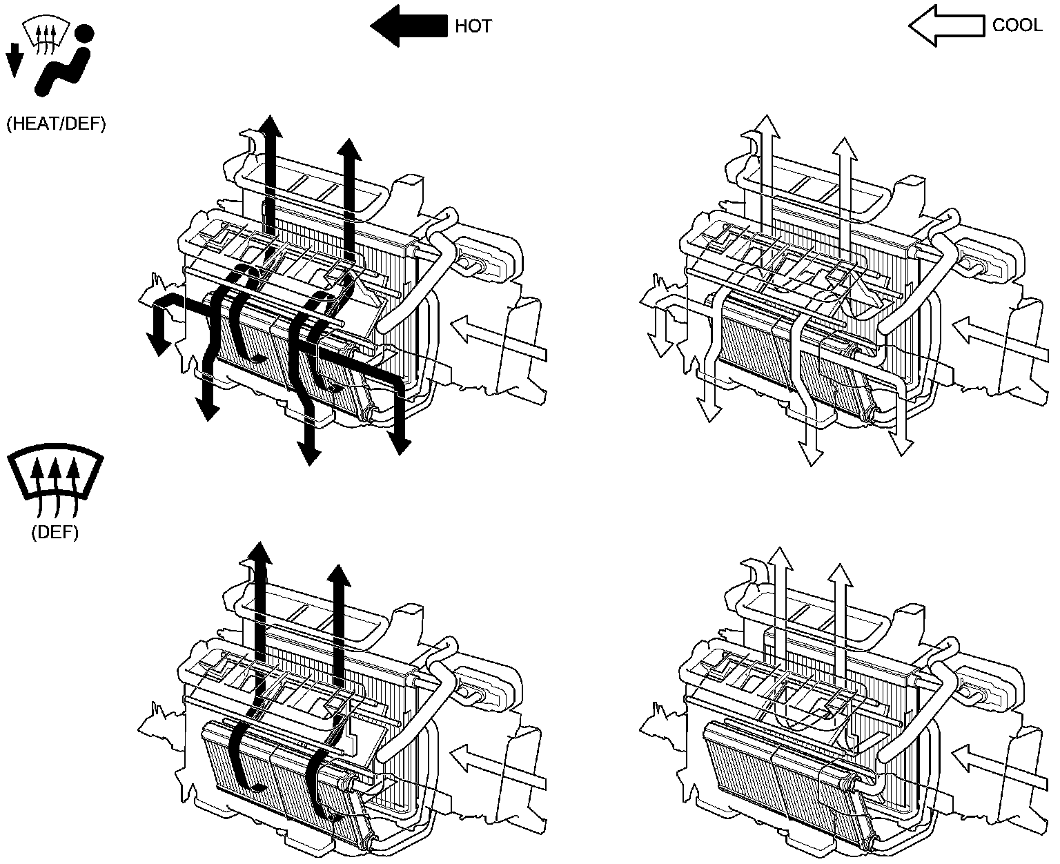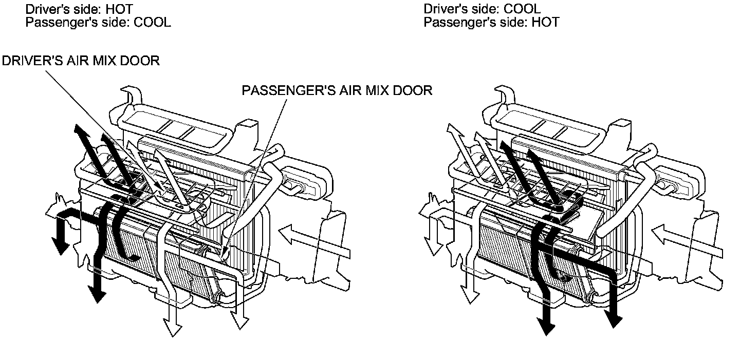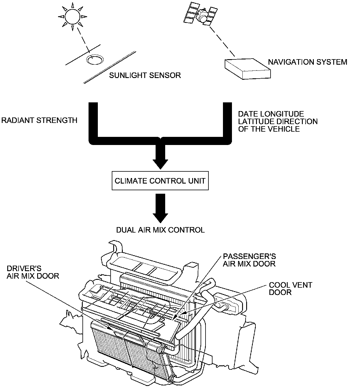 This system automatically controls the temperature and the vent mode of the air direction to the driver and passenger's side depending on the angle of the sun and the direction of the vehicle. It calculates information such as date, time, longitude, and latitude from the navigation system, as well as the radiant strength of the sun from the sunlight sensor, to determine the appropriate mode position and temperature to be directed to each side.