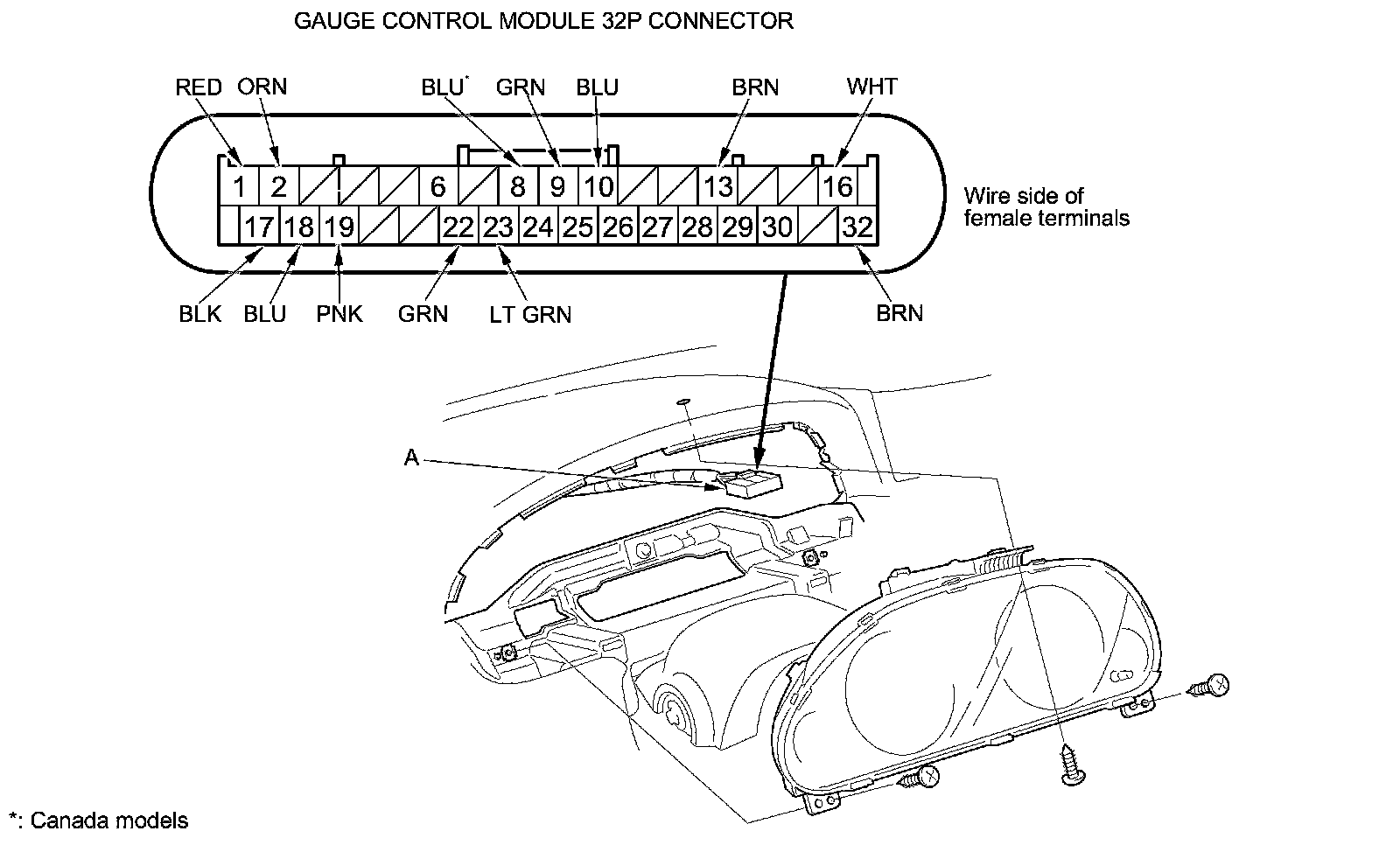 2. Remove the gauge control module, and disconnect the 32P connector (A) from it.