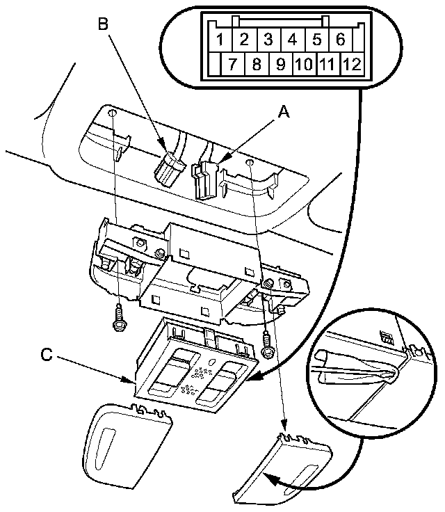 3. Remove the moonroof switch (C) from the map light housing.
