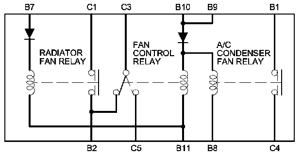 There should be continuity between terminals B1 and C4 when battery power is connected to terminal B10 (or B9), and battery ground is connected to terminal B8.