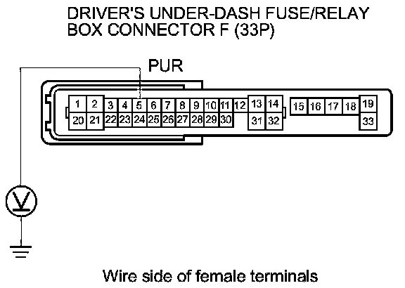 7. Measure the voltage between driver's under-dash fuse/relay box connector F (33P) terminal No. 5 and body ground.