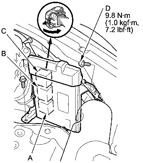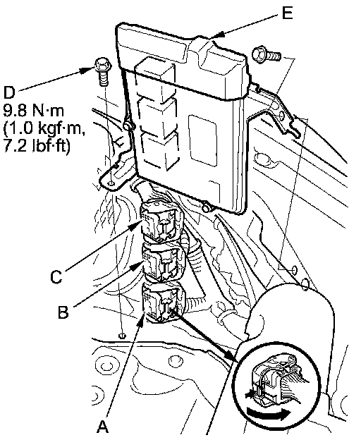 10. Disconnect ECM/PCM connectors A, B, and C, then remove the ECM/PCM assembly (E).