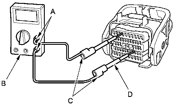 5. Connect one side of the patch cord's terminals (A) to a commercially available digital multimeter (B), and connect the other side of the terminals (C) to a commercially available banana jack (Pomona Electronics Tool No. 3563 or equivalent) (D).