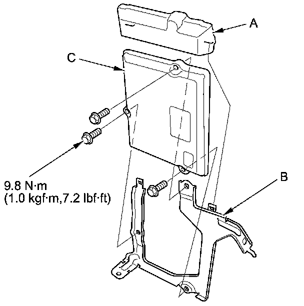 11. Remove the cover (A) and the bracket (B) from the ECM/PCM (C).