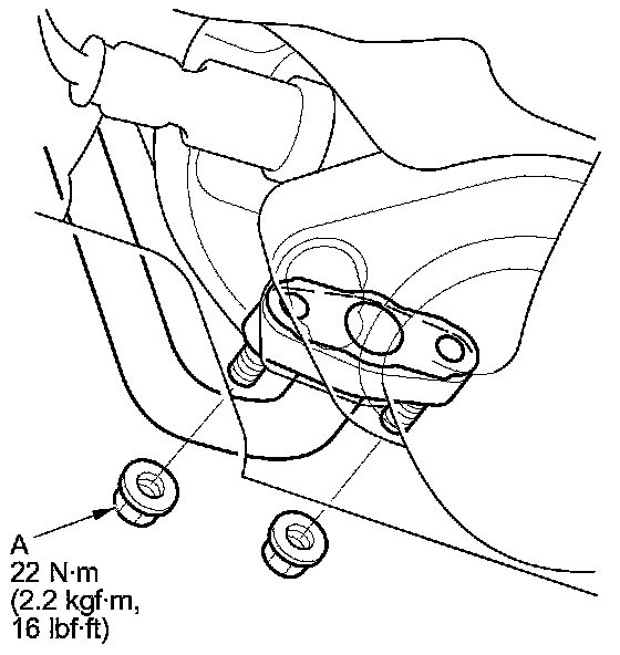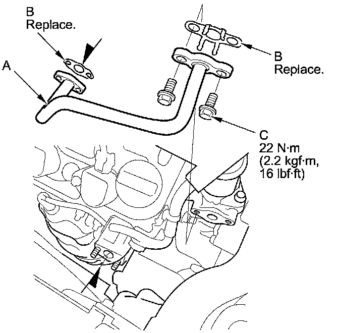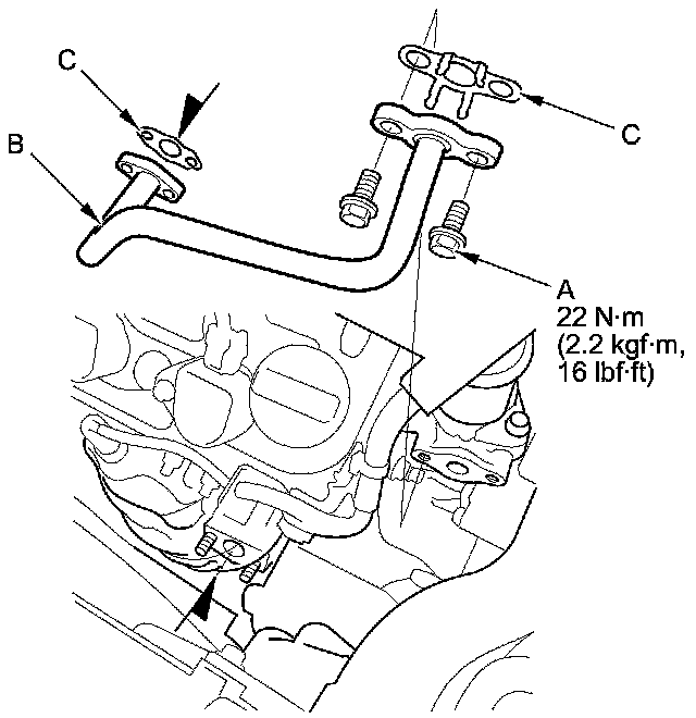1. Set the EGR pipe (A) with new gaskets (B), and tighten the EGR pipe mounting bolts (C).