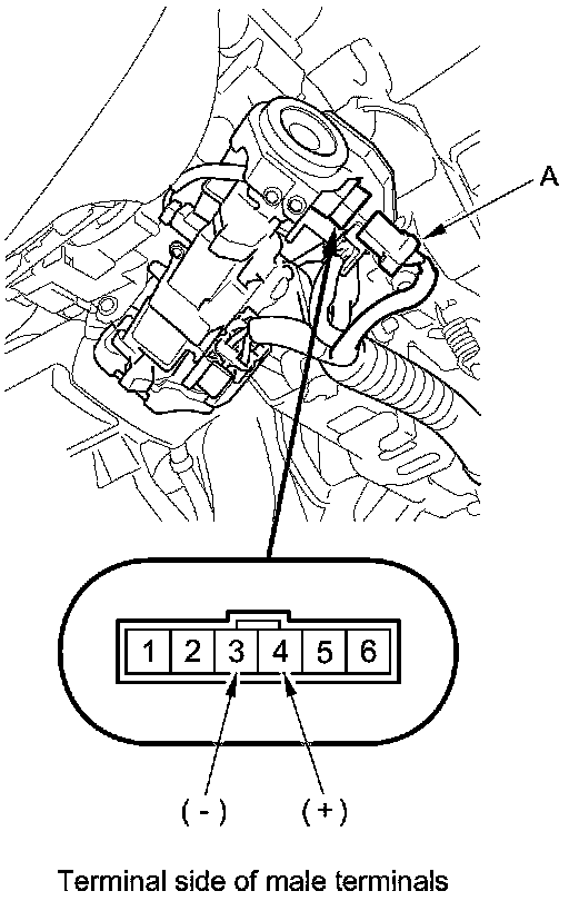 4. Connect power to steering lock 6P connector terminal No. 4, and ground 6P terminal No. 3. Check that the ignition key cannot be turned to LOCK (0). Disconnect power and check that the key can be turned to the LOCK (0) position and removed from the cylinder.