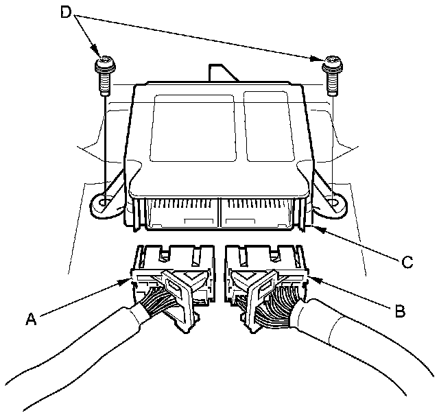 2. Install the new TORX bolts (A) using a TORX T30 bit, then connect the connectors (B) to the SRS unit (C); push them into position until they click.