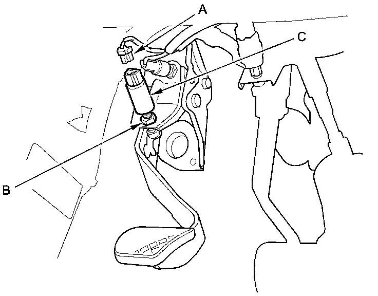 2. Loosen the locknut (B), then remove the clutch pedal position switch (C).