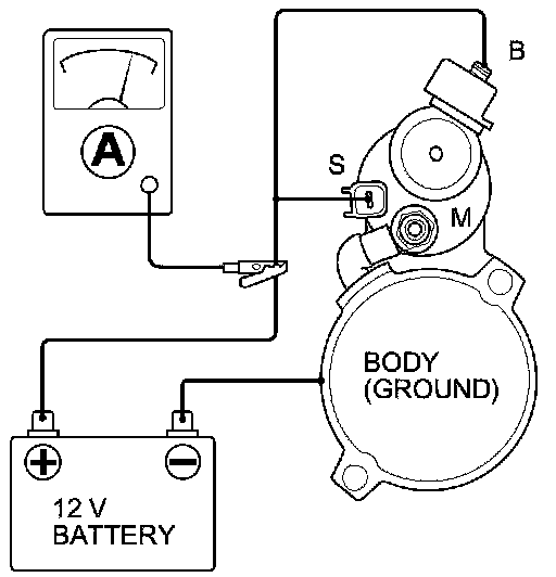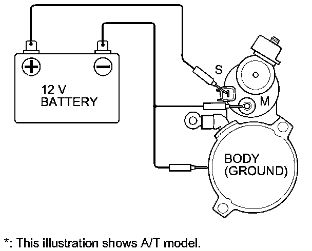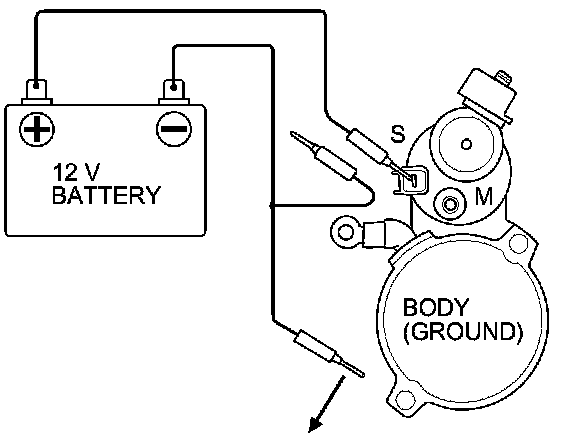 5. Connect the battery as shown. Make sure you disconnect the starter motor wire from the M terminal. If the starter pinion moves out, it is working properly.
