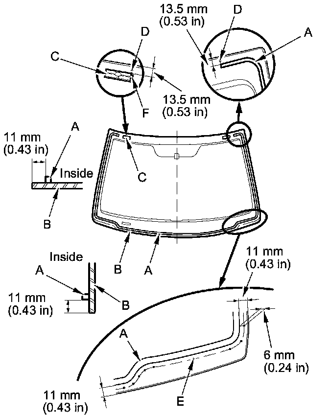 18. Apply a light coat of glass primer to the windshield (A) along the edge of the windshield molding (B) and the rubber dams (C) as shown, then lightly wipe it off with gauze or cheesecloth: